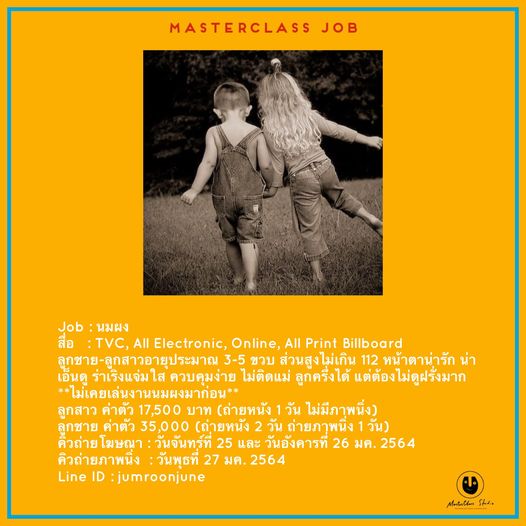 [ad_1] งานของเด็กๆจ้า มีลูกส่งลูก มีหลานส่งหลานจ้า ?? Job : นมผง สื่อ : TVC, All Electronic, Online, All Print Billboard ลูกชาย-ลูกสาวอายุประมาณ 3-5 ขวบ ส่วนสูงไม่เกิน 112 หน้าตาน่ารัก น่าเอ็นดู ร่าเริงแจ่มใส ควบคุมง่าย ไม่ติดแม่ ลูกครึ่งได้ แต่ต้องไม่ดูฝรั่งมาก...